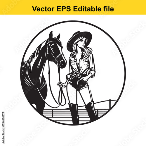 Monochrome Portrait of Cowgirl and Horse within a Circle, Capturing the Essence of Western Elegance and Equestrian Spirit