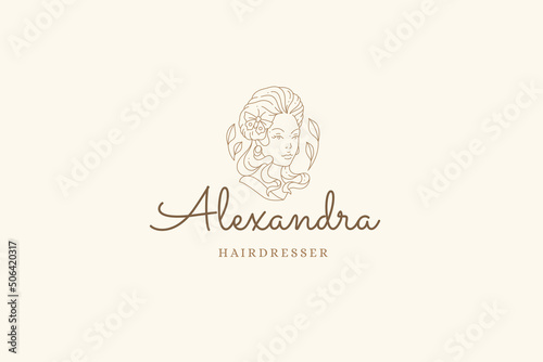 Monochrome woman ancient bust with elegant hairstyle natural flower butterfly line art logo vector