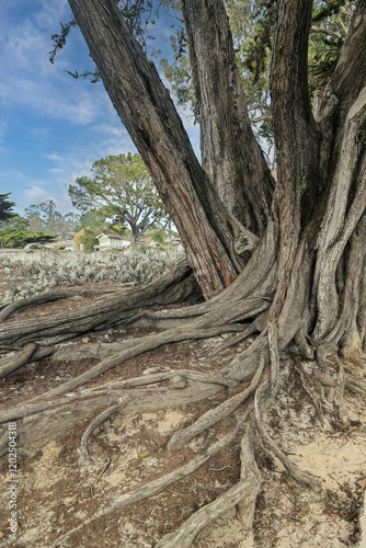 Monterey Cypress tree growing on Carmel beach in Carmel Bay on a beautiful blue sky day.