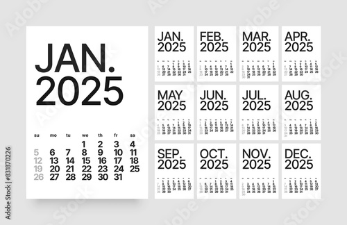 Monthly calendar template for 2025 year. Wall or desk calendar in a minimalist style. Diary planner for 2025 year. Week Starts on Sunday.