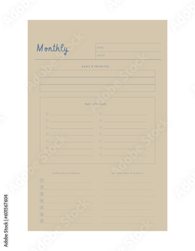 Monthly Plan. Minimalist planner template set. Vector illustration.