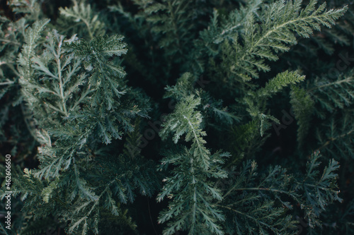 Mood trendy dark green fern yarrow leaves background. Yarrow, Woundwort, Milfoil, Staunchweed, Herbe Militaris, Achillea millefolium