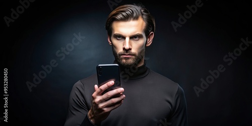 Moody minimalist dimly lit studio setup guy holding sleek modern smartphone isolated on pitch-black background showcasing cutting-edge technology advancement