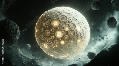 moon with intricate patterns and glowing symbols etched into its surface. The moon is partially illuminated by a distant star,