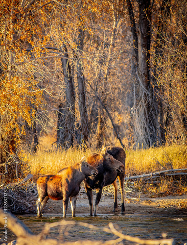 Moose mother and calf drink outside Yellowstone Park
