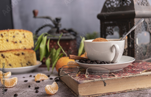 Morning breakfast.Still life with coffe, cakes, cinnamon, nuts and branches of spruce.