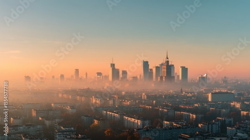 Morning cityscape with skyscrapers and sunlight filtering through urban smog