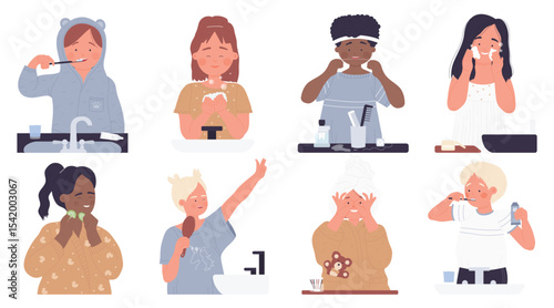 Morning daily kids routine set vector illustration. Cartoon hygiene of child characters in home bathroom collection, little children brush teeth and wash face, girl holding comb isolated on white