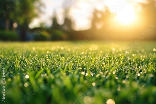 Morning dew glistens on fresh grass as sunlight breaks through the trees in a serene garden