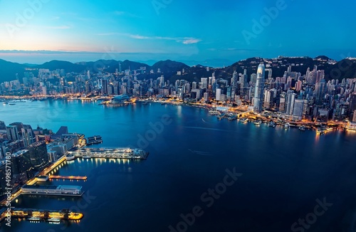 Morning scenery of Hong Kong & Kowloon before sunrise with city skyline of crowded skyscrapers by Victoria Harbour & ships between Tsim Sha Tsui & Central Ferry Piers ~ Beautiful cityscape of Hongkong