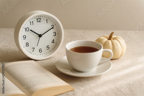 Morning tea with clock, book, and mini pumpkin for cozy autumn ambiance. set the clocks back by one hour