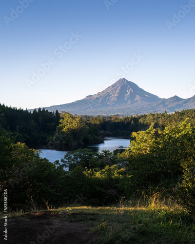 Morning view of Mt Taranaki from Lake Mangamahoe, New Plymouth. Vertical format.