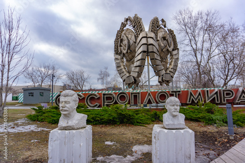 Moscow, Russia, May 29, 2019: Old communist statue of Lenin and Stalin in public green Gorky park