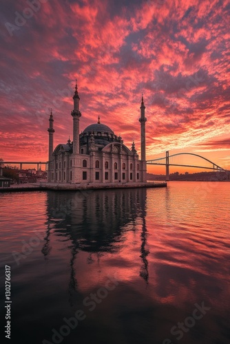 Mosque reflecting in water at sunrise.