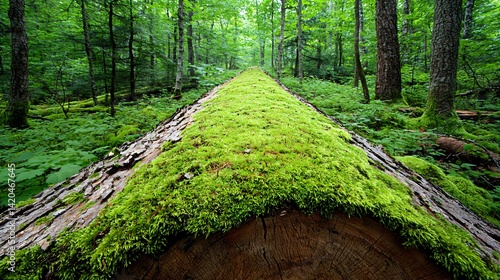 Moss-encrusted log in forest clearing under radiant daylight, textures showing fine fibers, surrounding area softly lit with visible tree trunks and roots, peaceful earthy palette