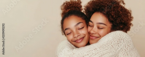Mother and daughter embracing in white sweater on neutral background for family, love, and lifestyle concept