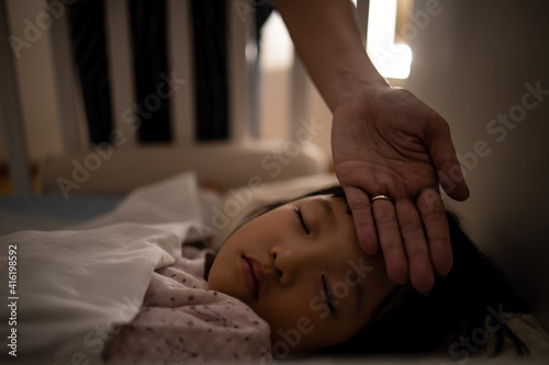 Mother checks the temperature of her kid. Concept for health and take care of children.