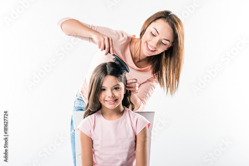 Mother combing daughters hair