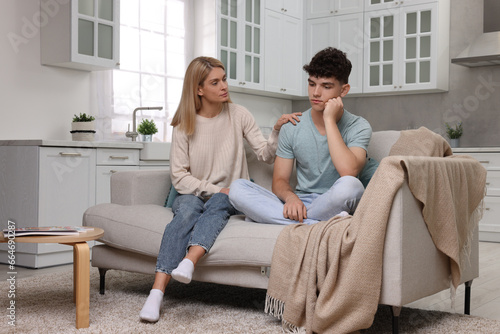 Mother consoling her upset son at home. Teenager problems