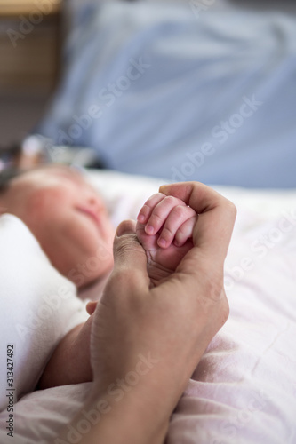 Mother hold baby’s hand in her palm (selective focus)
