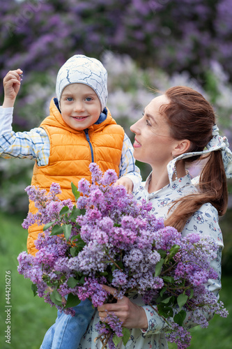 Mother hold embrace cute little child son, mom and small kid hugging cuddling enjoying time together on summer nature.