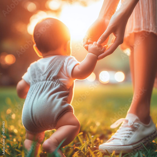 Mother holding her baby hand in the park. Happy family concept.