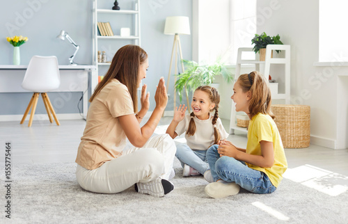 Mother playing with children at home, engaging in active games. The family enjoys a fun and happy leisure time, sharing laughter and excitement as they bond through these joyful moments.