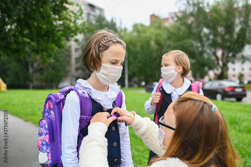 Mother puts a safety mask on her daughter's face. Schoolgirls ready go to school. Little sisters with a backpack outdoors. Back to school. Medical mask to prevent coronavirus. Social distance.