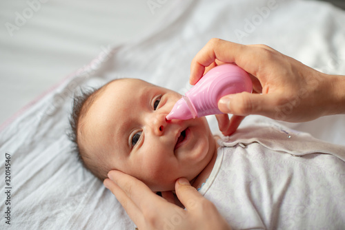 happy, smiley face, smile, adorable, beautiful, mother, pump, allergy, congestion, treatment, sick, bulb, aspirate, blower, vacuum, virus, drainage, sucker, using, cleaning, respiratory, hygiene, lying, face, equipment, mucus, closeup, snot, breathe, caucasian, flu, little, white, instrument, suction, medicals, hand, newborn, mother, cleaner, infant, care, children, nose, health, medicine, nasal, baby