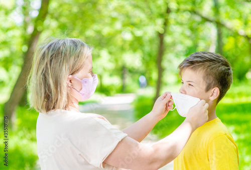 Mother wearing protective face mask helps put on a mask for her young son while they are in a public place