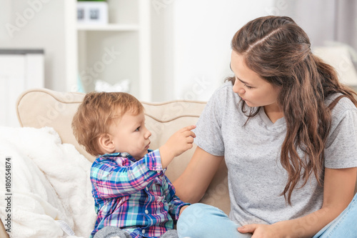 Mother with baby boy on sofa at home
