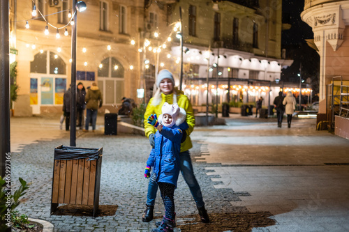 Mother with child girl at Christmas market celebrating New Year holiday. Family outdoor winter activity. Mom and daughter spend time together. Authentic lifestyle.