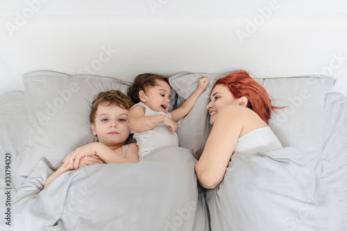 mother with her children son and daughter in white t-shirts waking and having fun