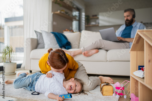 Mother with small daughter playing indoors at home, everyday life and home office with child concept.