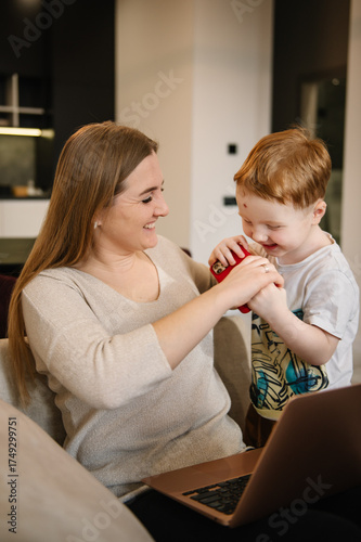 Mother working from home with kid. Quarantine and closed nursery school. Distance learning through war. Child make noise and disturb woman work. Homeschooling and freelance job. Stay at home.