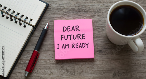 Motivational Note on Pink Sticky Note with Coffee and Notebook on Wooden Desk
