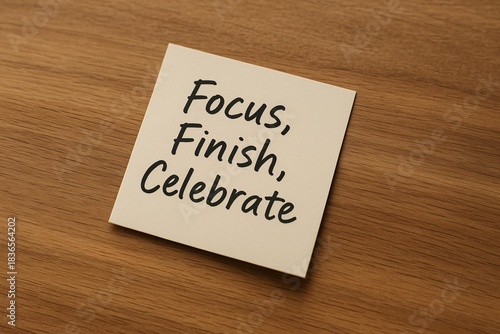 Motivational Quote: Focus, Finish, Celebrate on Wooden Background