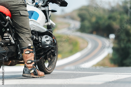Motorcycle in a sunny motorbike on the road riding.with sunset light. copyspace for your individual text.On the road.
