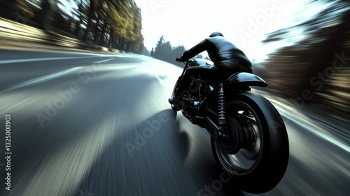 Motorcycle rider speeds down country road; trees in motion blur