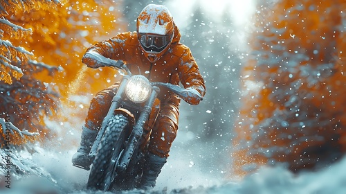 Motorcycle Riding Through a Snowy Forest Landscape in Winter