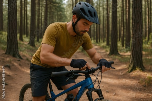 Mountain biker adjusting handlebars on his bike, taking a break during his ride in a peaceful pine forest