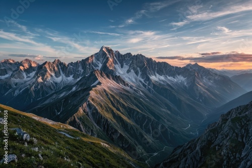 Mountain landscape at sunset with warm light and shadow