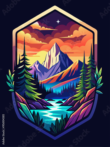 Mountain Landscape with Sunset and River in a Hexagon Frame