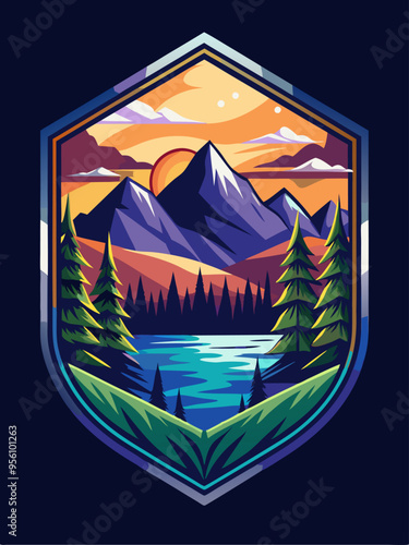 Mountain Landscape with Sunset, Lake, and Forest in a Shield Shape