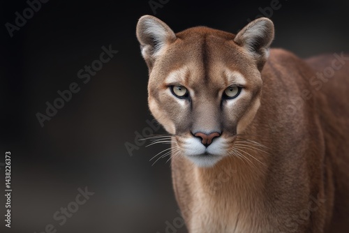 Mountain lion standing still on dark backdrop with focused forward gaze under dramatic lighting showing feline posture strength and natural wildlife presence