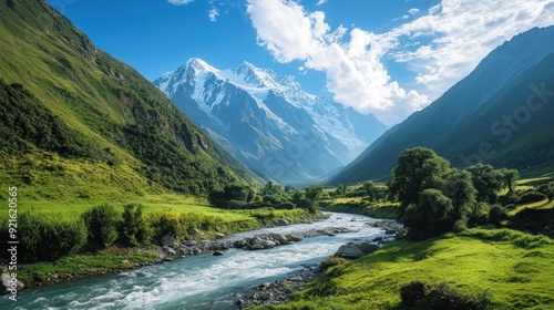 Mountain River Winding Through Lush Green Valley with Snow-capped Peaks