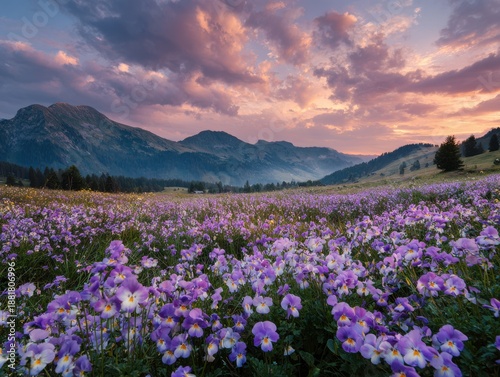 Mountain Valley Filled with Purple Wild Pansies at Sunrise or Sunset viola flower field