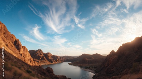 Mountain view with water body and blue sky during sunset near rocky landscape
