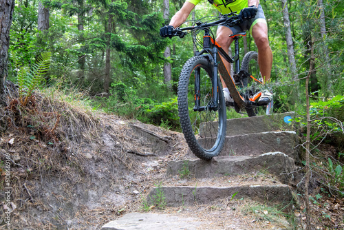 Mountainbiker an einer schwierigen Stelle (Pfälzerwald, Deutschland)