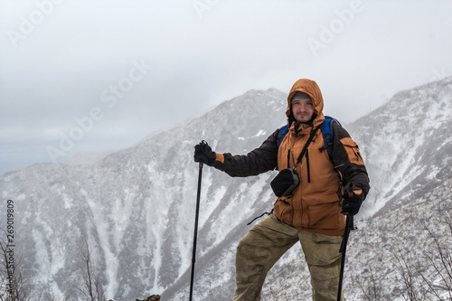 Mountaineer or extreme tourist in winter equipment stands on the background of snowy mountain peaks, relying on trekking or ski poles